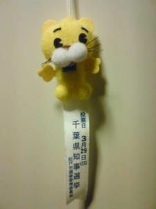 投票をすませると、ティッシュとかあぶらとり紙だとか、なんかおまけがいただけます。瑠璃は千葉の選挙のマスコットになっている黄色いトラ?のちっちゃなぬいぐるみを手に取りました(なぜトラなのかしら)